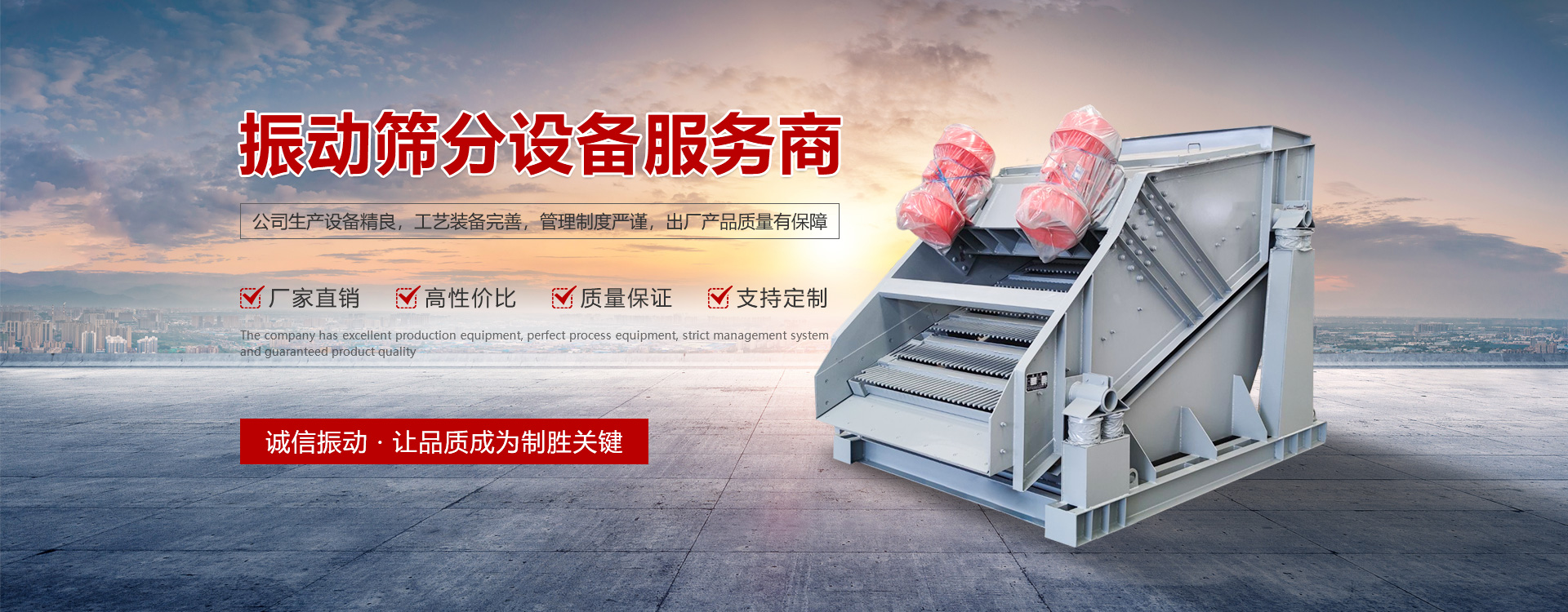 新鄉(xiāng)市誠信振動設備有限公司是國內生產振動設備及礦山機械設備的生產廠家,公司集研發(fā)、 設計、生產、 銷售為一體化,注冊資金5800萬元,職工500余人,技術人員80余人。公司位于河南省新鄉(xiāng)市小冀經濟開發(fā)區(qū),占地8萬平方米,建筑面積6.8萬平方米。并通過了ISO質量體系認證,歐盟使用產品強制性的CE認證。公司的主要產品有系列振動電機、振動篩、多元環(huán)保篩、彈性環(huán)保篩、振動給料機、振動輸送機、破碎機、皮帶機、斗式提升機、鏈斗輸送機等多種產品及其配件,共計20多個系列,400多種規(guī)格。產品廣泛用于冶金、礦山、煤炭、化工、建材、電力、路橋工程等行業(yè)。 [了解詳情]